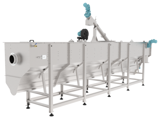WAU-SW (Settling + Floatable Removal Unit)Pre-treatment of organic streams to remove grit and floating debrisUp to 97 % removal efficiency for particles ≥ 200 µm; dewaters grit to ~20 % DM; multi-stage separation + surface scrapers in SW variantAvailable in flows 10–100 m³/h; built with AISI 304L/316L; low energy, continuous operation